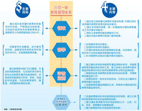 据教育部督导办负责人介绍,《意见》根据教育督导督政、督学、评估监测的三大职能,明确了深化教育督导改革的工作目标:督政方面,建立地方政府履行教育职责督导评价机制,严格落实问责制度,引导地方政府优先发展教育事业,提高基本公共教育服务能力和水平。督学方面,完善督学队伍管理,实行督学责任制,监督指导各级各类学校规范办学行为,全面提高教育质量。教育质量评估监测方面,建立教育督导部门归口管理、专业机构提供服务、社会组织多方参与的专业化教育质量评估监测体系,对各级各类教育进行科学、系统、权威的评估监测,为改进教育教学、管理、决策提供依据和支撑。