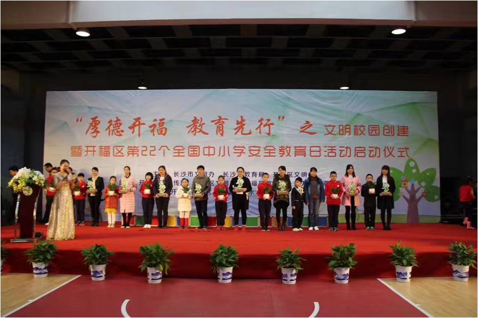 为进一步培育和践行社会主义核心价值观,进一步展示我区中小学“文明校园”创建成果,增强学生的安全意识,3月24日下午2点,“厚德开福 教育先行”之文明校园创建暨开福区第22个全国中小学安全教育日活动启动仪式在清水塘实验小学成功举行。长沙市文明办未成年人工作处处长朱治东、长沙市教育局文明办副主任杨世文、区委宣传部副部长、文明办主任罗海嵩、区政府主任督学毛建高、区教育局党委委员、副局长谭广林、捞刀河街道办事处主任出席了仪式,全区中小学、幼儿园安全分管领导也参加了此次活动。