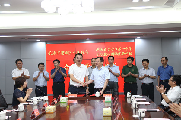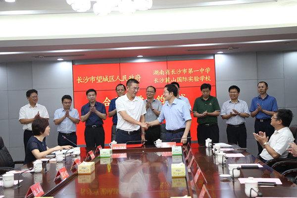 市教育局党委书记、局长卢鸿鸣,市一中党委书记、校长廖德泉,长郡中学副校长兼麓山国际实验学校校长邓智刚,区委书记孔玉成,区委副书记、区长范焱斌,区领导余学辉、喻金平、骆志平、姚建刚、戴水文、苏敏芳出席签约仪式。